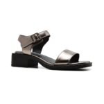 Sandalia Korium Raizen de vestir en charol plateado con taco bajo y diseño minimalista. Diseño elegante y moderno con pulsera ajustable al tobillo, ideal para acompañar looks de noche o eventos especiales con comodidad y estilo.